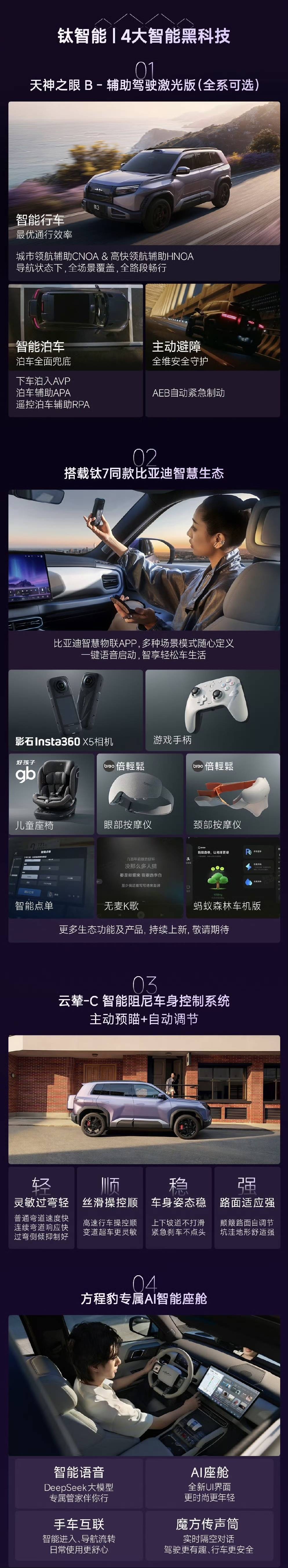 在核心技术与基础配置方面,钛 3 闪充版全系基于智能 EVO+ 平台打造,搭载比亚迪第二代刀片电池并采用CTB电池车身一体化技术。车辆标配比亚迪闪充技术、云辇-C+主动预瞄系统以及“天神之眼”辅助驾驶系统。座舱内部配备15.6英寸中控多媒体屏和12英寸W-HUD,提供AI智能座舱、前排座椅通风加热、方向盘加热及6kW对外放电等功能,同时保留了151L电动前备箱与车尾28L储物空间的物理拓展。